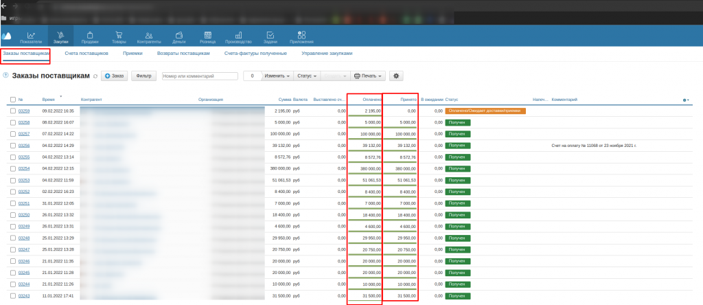 В закупках мы не ведем никакого учета в разрезе денег по контраагенту (заказы и поставки) Простой интерфейс Есть отдельный модуль приемки товара, при котором происходят проверки на правильную заполненость товара данными (габариты и вес), так же происходит облейка товара