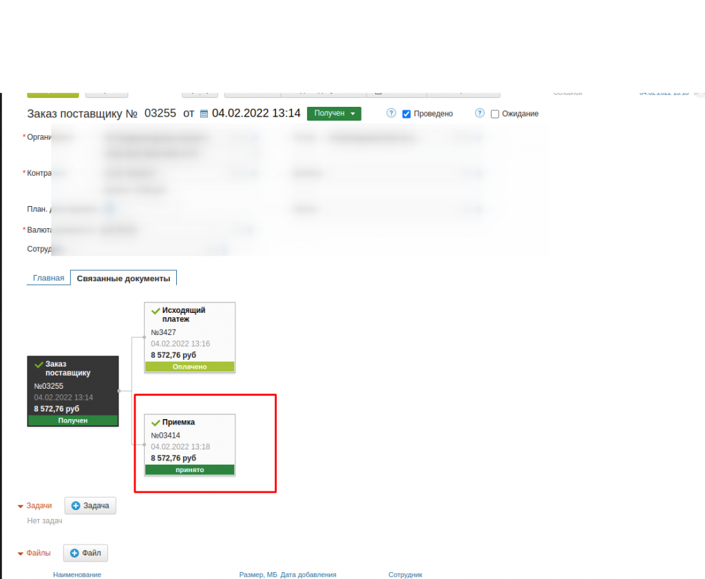 Дальше можно создать исходящий документ и премку, так же есть система статусов.