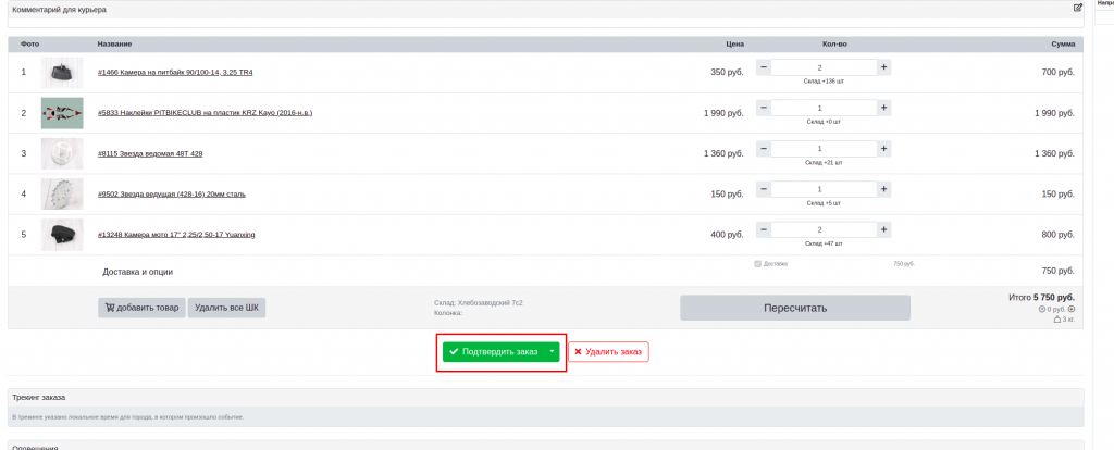 После того, как менеджер свяжется с клиентом и подтвердит адрес и список товаров, он нажимает кнопку - заказ подтвержден.
